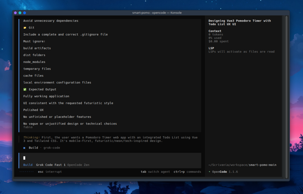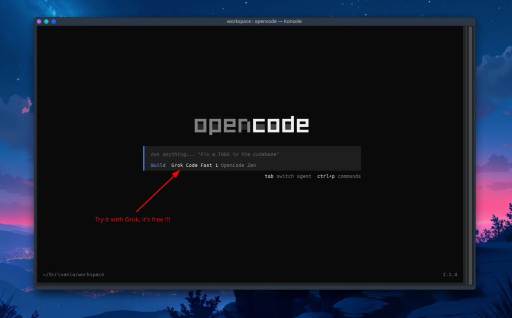 For this experiment, I used OpenCode, an AI coding agent that runs directly from the terminal, together with Grok Code.