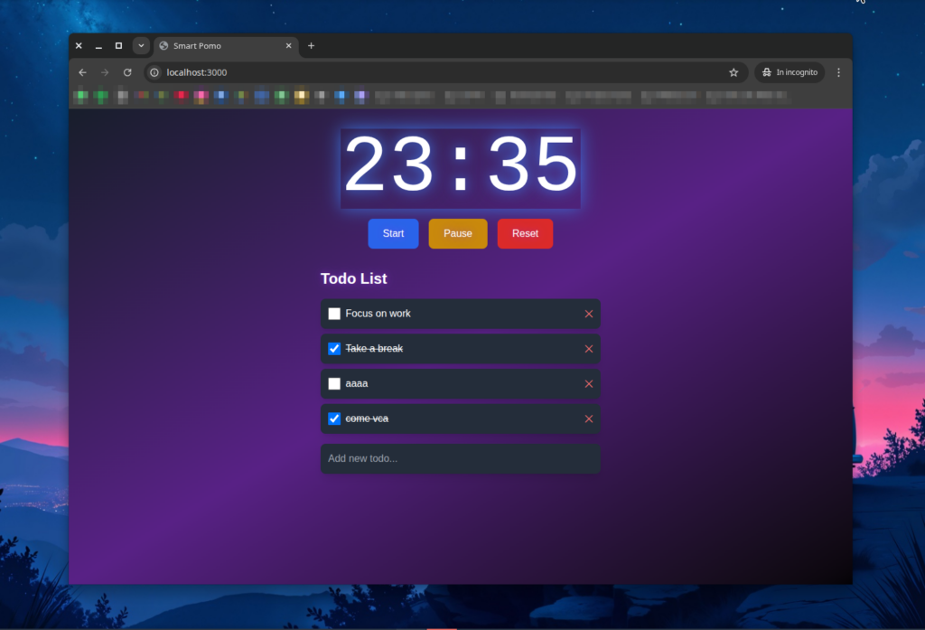 The goal was simple but meaningful: create a web-based Pomodoro Timer with an integrated Todo List, with a strong focus on UX and visual polish, using Vue 3 and Tailwind CSS.